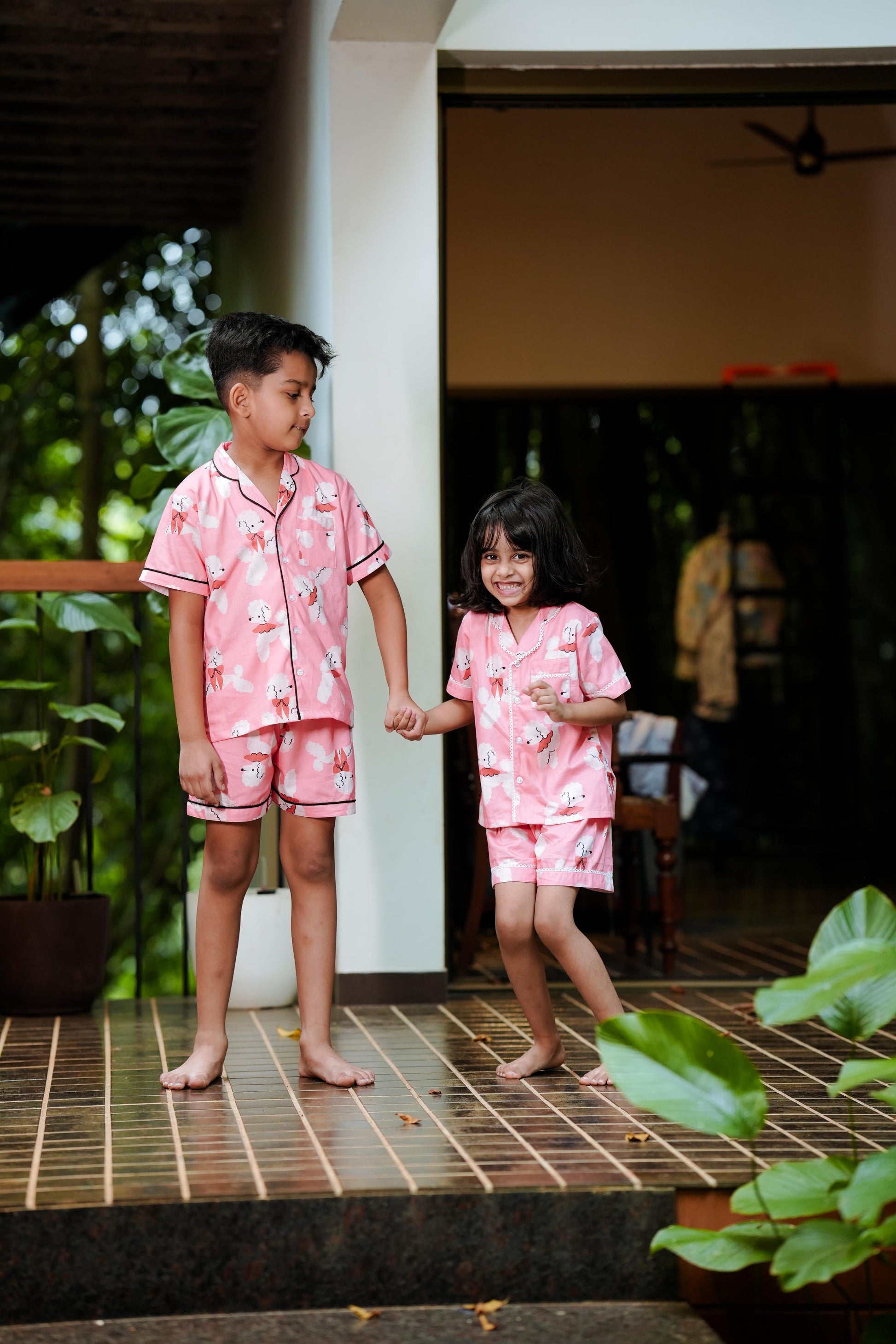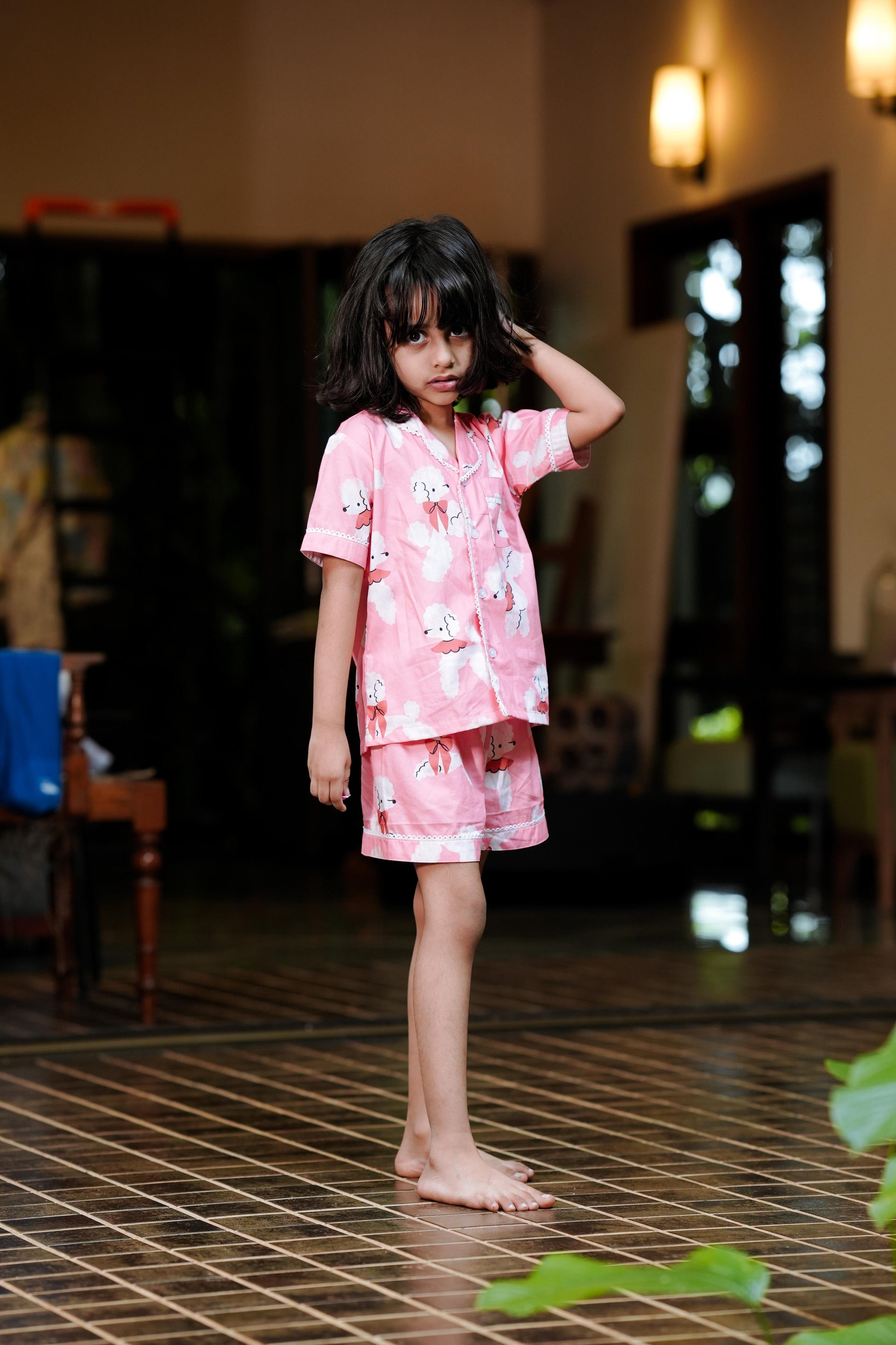 Keep bedtime playful with this soft cotton short-sleeve PJ set in a cheerful pink shade. Featuring an adorable poodle print and delicate lace trim, itβs lightweight, breathable, and perfect for warm nights.